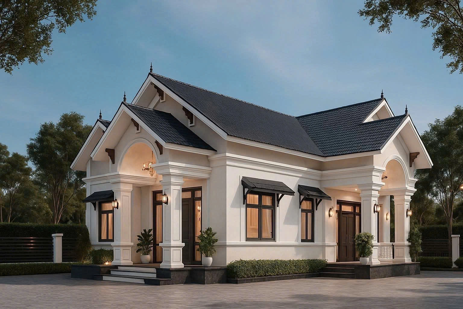 Nhà mái Thái nổi bật với kiến trúc cao ráo, thanh thoát và đầy ấn tượng. Hệ mái có độ dốc lớn, thiết kế chồng lớp tinh tế giúp thoát nước mưa nhanh, đồng thời tạo cảm giác bề thế và sang trọng cho toàn bộ ngôi nhà. Những đường nét mái vươn cao, cân đối làm tôn lên vẻ đẹp mạnh mẽ nhưng vẫn hài hòa.